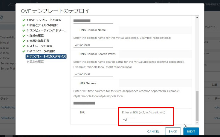 Cloud Builder를 전개합니다. 가상 어플라이언스이므로 간단히 전개할 수 있습니다만 「템플릿의 커스터마이즈」의 「SKU」에서 전개할 환경을 지정해줘야 합니다. 이유는 전개 형태에 따라 초기 도입의 파라미터가 다르기 때문입니다. 여기서는 「vcf」를 지정합니다.