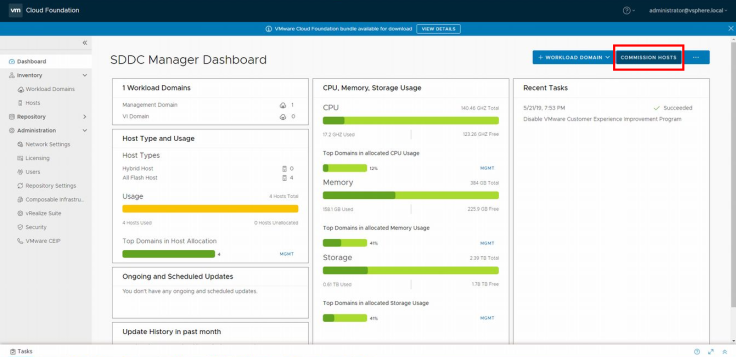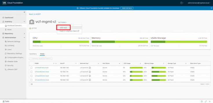 「Inventory」의 「Workload Domains」에서 Management Domain을 선택후 「Add Host」를 실행합니다.