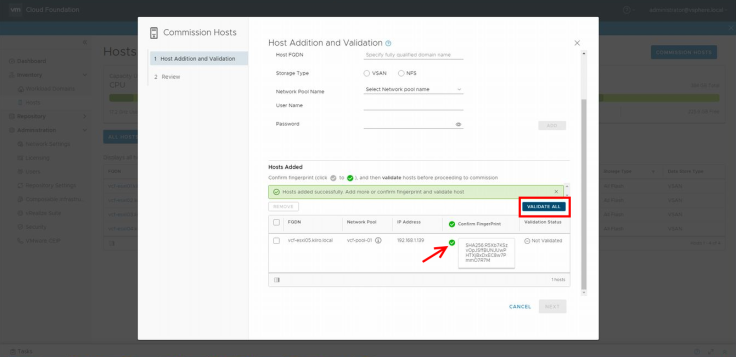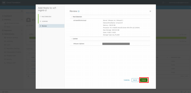 「FINISH」를 클릭하면 호스트가 Management Domain에 할당됩니다.