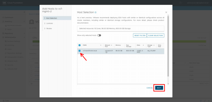 위탇 상태의 호스트가 표시되므로 할당할 호스트를 선택합니다. ※여기에서는 1 호스트밖에 없습니다만 WLD를 만들 경우는 여러 대의 호스트를 동시에 지정할 수 있습니다. 여러 대를 지정할 경우 작성하는 WLD의 최소 구성 호스트 수도 체크되어집니다. 예를들어 vSAN 구성일 경우 3 호스트를 선택하지 않으면 경고가 표시되어 그 이상 진행을 할 수 없습니다.