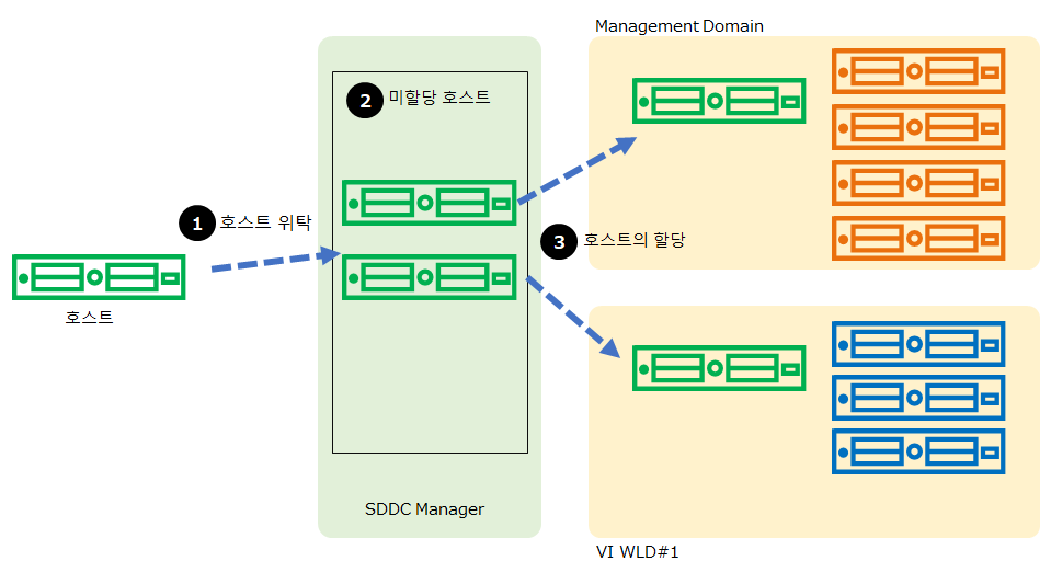 지난 회 설명했던 SDDC Manager의 역할에는 WLD나 호스트 관리가 있었습니다. VCF 환경에서는 SDDC Manager를 이용하지 않으면 호스트를 추가, 삭제할 수 없습니다. 직접 vCenter에서 호스트를 추가하여도 WLD의 리소스로는 사용할 수 없습니다.