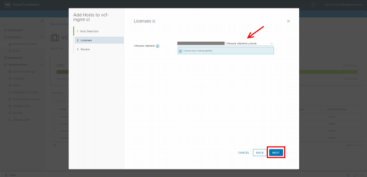라이센스를 지정합니다. 라이센스는 SDDC Manager에서 등록한 라이센스가 표시됩니다.