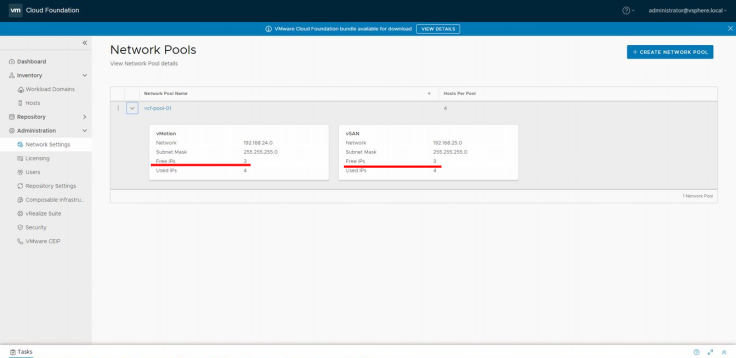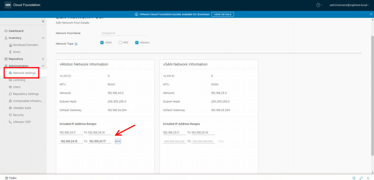 호스트를 추가하기 전에 「Network Settings」에서 IP 어드레스 풀의 범위를 확장합니다. Management Domain를 전개할 때 4 호스트분의 IP 어드레스만을 지정했기 때문에 vSAN나 vMotion용의 IP 어드레스가 부족하거든요.