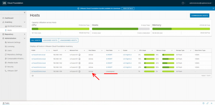 추가한 호스트는 「Hosts」에서 확인할 수 있습니다. 여기서 추가한 호스트의 상태를 확인해보면 status는 ”Active”입니다만 호스트의 state를 ”Unassigned”인 것을 알 수 있습니다. ”Unassigned”는 VCF의 리소스로써 추가된 상태이지만 그 어느 WLD에도 할당되지않은 상태를 의미합니다.