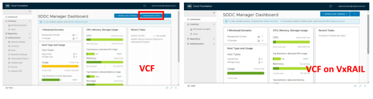 Management Domain 전개후 VCF on VxRAIL는 ESXi 호스트의 위탁(Commission)이 필요 없습니다. VxRAIL 클러스터에 노드를 추가하여 SDDC Manager에서 WLD에 ESXi 호스트를 추가하기만 하면 됩니다.