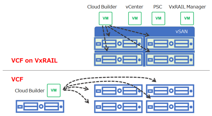 VCF on VxRAIL은 vSAN도 vDS도 클러스터도 구성되기 때문에 Cloud Builder를 동일한 클러스터 위에 설치할 수 있습니다. VCF는 vSAN이나 vDS가 구성되지 않은 상태이기 때문에 Management Domain의 Bringup에 필요한 Cloud Builder를 별도의 클러스터(또는 ESXi 호스트)에 설치해야 되죠.