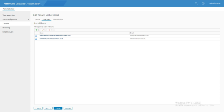 기념(?)으로 vRA 관리 UI에 접속해봤습니다. 설치 마법사에서 지정한 테넌트 관리자도 로컬 이용자로 등록되어있는 것도 확인되었습니다.