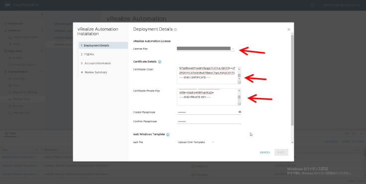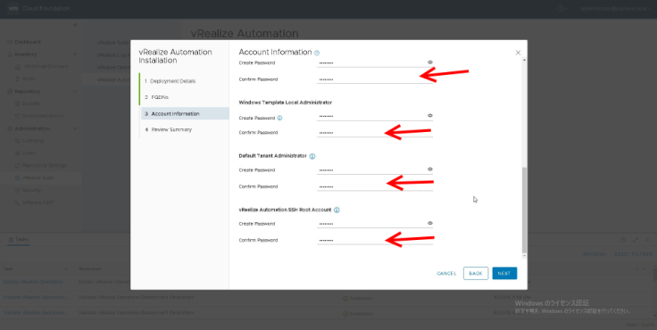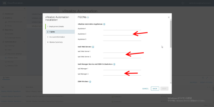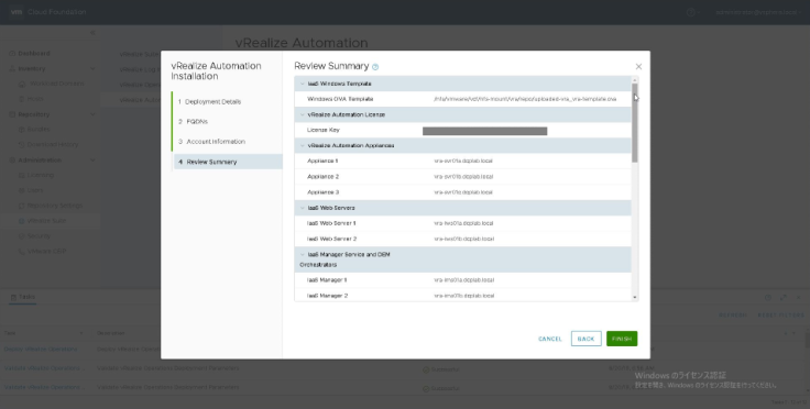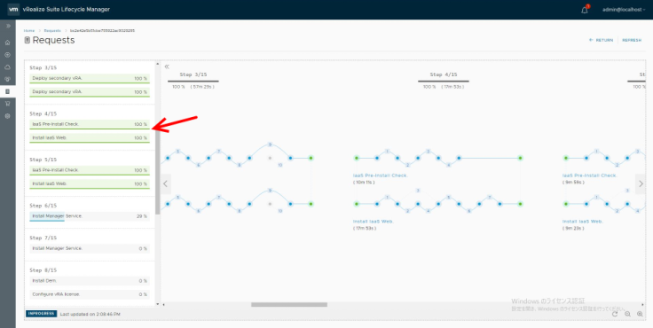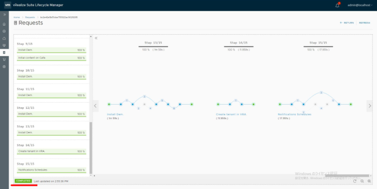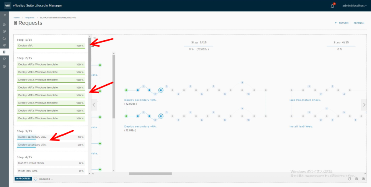 vRSLCM에서 확인해보죠. vRA의 설치는 전부 15 스텝으로 구성되어있습니다. 스텝 1에서는 최초의 vRA 어플라이언스가 설치됩니다. 이후는 업로드한 Windows 서버 템플릿을 통해 8대의 가상 머신이 전개됩니다. Windows의 컴포넌트가 전개되었다면 이번에는 2대, 3대의 vRA 어플라이언스가 설치됩니다.