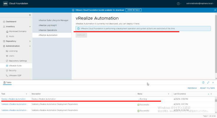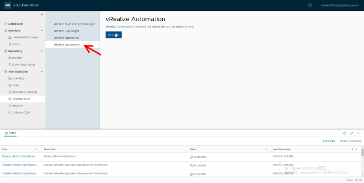 SDDC Manager로부터 「vRealize Automation」를 선택하여 「Deploy」를 실행합니다.