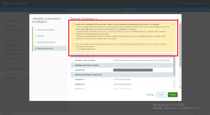 자동적으로 설치된다고 하더라도 규모가 너무 큽니다. 가상 머신도 너무 많아요, 서비스 프로바이더가 아닌 이상 이렇게 큰 규모의 vRA 환경을 이용하는 기업이 어느 정도나 될까요. ”Minimal Deployment”의 선택이 있어도 좋지 않을까 싶습니다. 정 ”Minimal Deployment”로 vRA를 설치하고 싶다면 SDDC Manager이 아니라 vRSLCM에서 설치해야 됩니다. (하지만 vRSLCM에서 설치했을 경우는 VCF의 지원 대상에서 제외되므로 주의가 필요합니다)