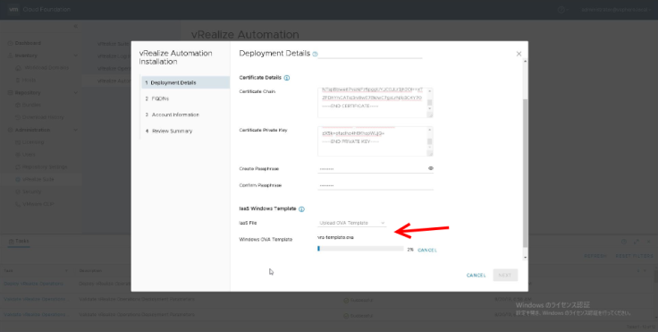라이센스와 인증서를 입력 후 작성한 Windows 서버 템플릿 (.ova)을 업로드합니다. ※ova의 익스포트는 과거의 포스팅을 확인하세요.