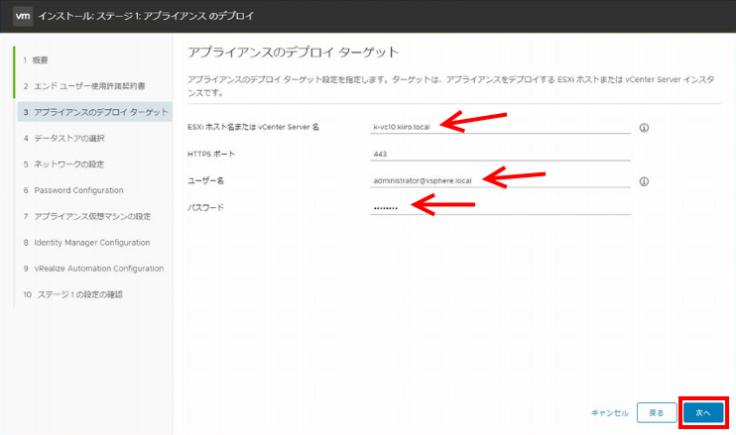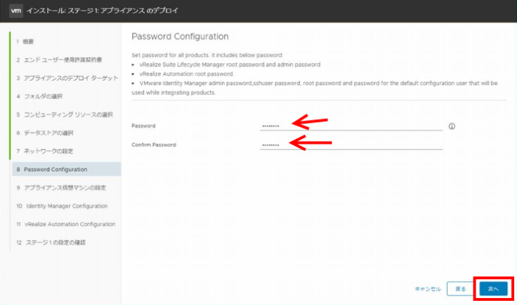 ※여기서 지정하는 패스워드는 ”설치된 패스워드”로써 동시에 설치하는 vRA나 vIDM의 root 그리고 admin의 패스워드가 됩니다. vRSLCM 설치 후 vROps나 vRB의 설치에도 이용이 가능하기에 각 제품이 지원을 하는 공통의 패스워드 생성 규칙에 따라 지정하는 것이 좋습니다. 예를들어 vRSLCM의 패스워드 생성규칙에 따라 설정을 했을 경우, vROps의 "패스워드 복잡함"이 vRSLCM의 패스워드 생성 규칙보다 엄격하기 때문에 vROps 설치가 실패할 수 있습니다.
