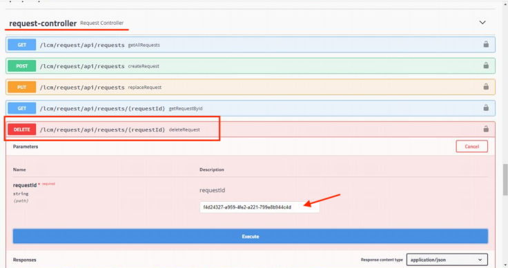 API 리스트에서 「request-controller」의 「DELETE」 파라미터에 Request ID를 입력 실행하면 됩니다.