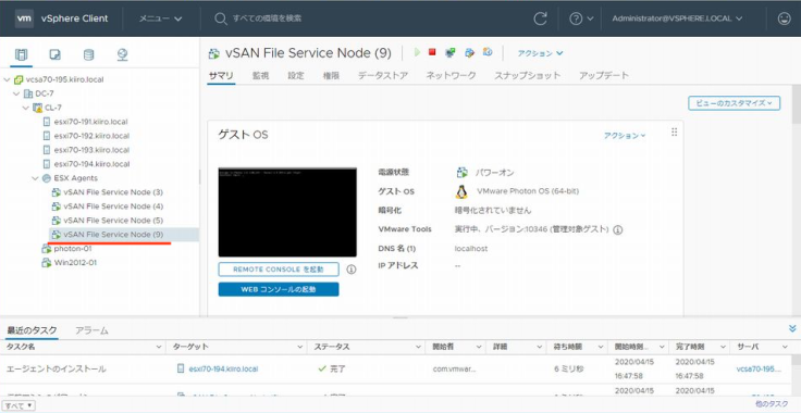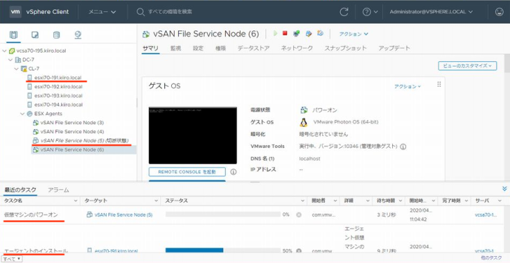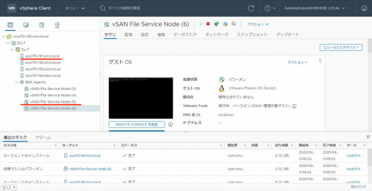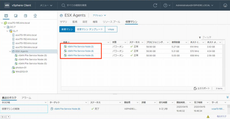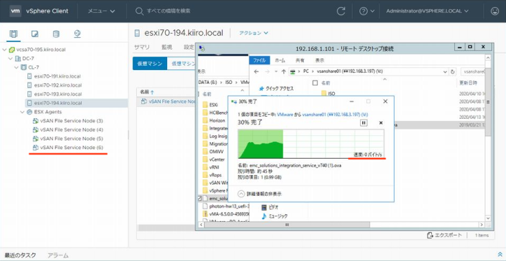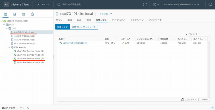 참고로 헤드 노드는 호스트 esxi70-192로 변경되어있습니다. 헤드 FSVM가 정지하므로써 실행 중이던 조작이 타임 아웃되어버리긴 합니다만 EAM가 FSVM을 곧바로 기동시키기 때문에 파일 서비스의 제공이 정지되는 일은 없습니다.
