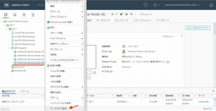 호스트 esxi70-194에서 가동중인 FSVM(8)을 정지후 「디스크로부터 삭제」를 실행했습니다.
