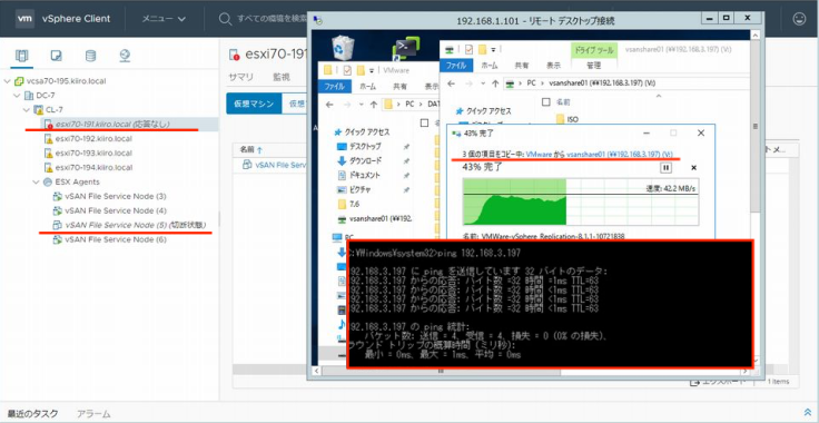 하지만 파일 공유에는 문제없이 접속할 수 있습니다. 기본 IP 어드레스로의 ping도 문제없이 소통되고 있습니다. 참고로 헤드 노드가 정지했을 경우는 파일 공유에의 접속이 타임 아웃되어 재접속해야 할 필요가 있습니다. 헤드 노드가 정지하면 나머지 ESXi 호스트에서 새롭게 헤드 노드가 선출됩니다.