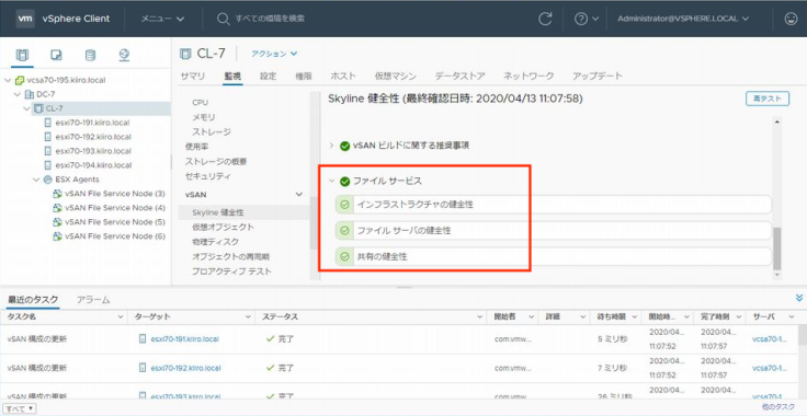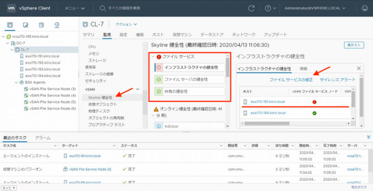 「vSAN」 → 「Skyline 건전성(vSAN 7.0부터 헬스는 프로액티브 지원 서비스 제품인 Skyline과 통합되었습니다)」 에서 「파일 서비스」를 확인해보면 "인프라스트럭쳐의 건전성"에서 호스트 esxi70-191의 파일 서비스에 이상이 있었던 것을 알 수 있습니다. 메시지를 확인해보면 "파일 서비스가 유효화 되지 않았다"는 것을 알 수 있습니다. 이 경우 「파일 서비스의 수정」을 실행하면 정상의 상태로 회복할 수 있습니다. ※「파일 서비스의 수정」을 반드시 실행할 필요는 없습니다. 그냥 내버려두어도 자동적으로 수정이 됩니다. ;)