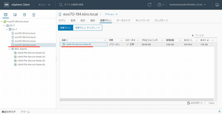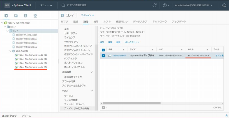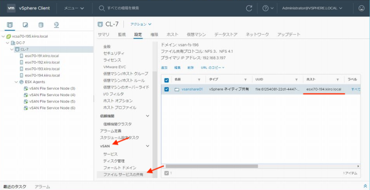 우선 어느 ESXi 호스트가 헤드 노드인지 확인해 보겠습니다. 헤드 노드는 「vSAN」 → 「파일 서비스의 공유」에서 확인할 수 있습니다. 여기서는 호스트 esxi70-194이군요.