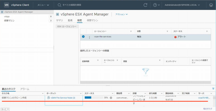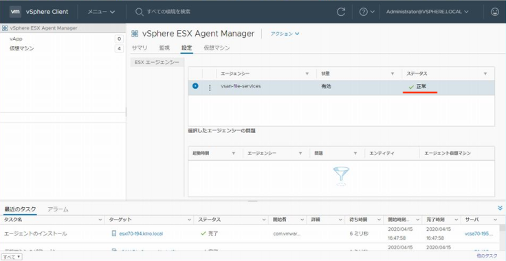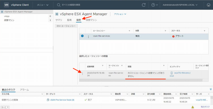 FSVM은 EAM에 의해 관리된다고 설명했죠. 「관리」 → 「vCenter Server의 확장 기능」에서 「vSphere ESX Agent Manager」를 확인해 보겠습니다. vsan-file-services의 상태는 "경고"로 호스트 esxi70-194의 FSVM이 없어진 것을 알 수 있습니다. 이 상태에서 이용 가능한 액션인 「문제의 해결」을 실행하면 호스트 esxi70-194 상에 FSVM이 새롭게 작성됩니다.(수동으로 실행하지 않아도 30초 정도 지나면 자동적으로 FSVM이 작성된답니다.)