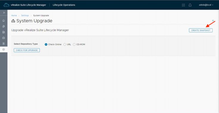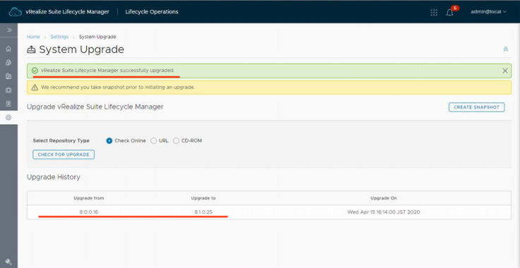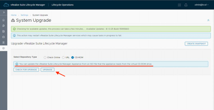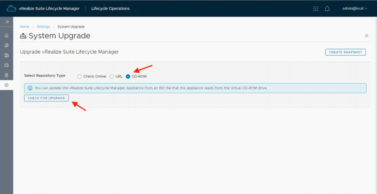 스냅숏 작성이 끝났다면 vRSLCM의 가상 CD 드리이브에 업그레이드용 ISO 파일을 마운트 하여 「CD-ROM」를 선택 후 「CHECK FOR UPGRADE」를 실행합니다. 업그레이드 가능한 버전 체크나 ISO 이미지의 이상 유무를 확인할 수 있습니다.