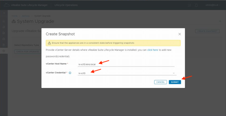 스냅숏 작성도 vRSLCM에서 실행이 가능합니다. 점점 쓰기 편해지고 있네요.