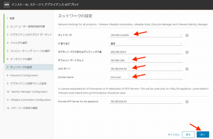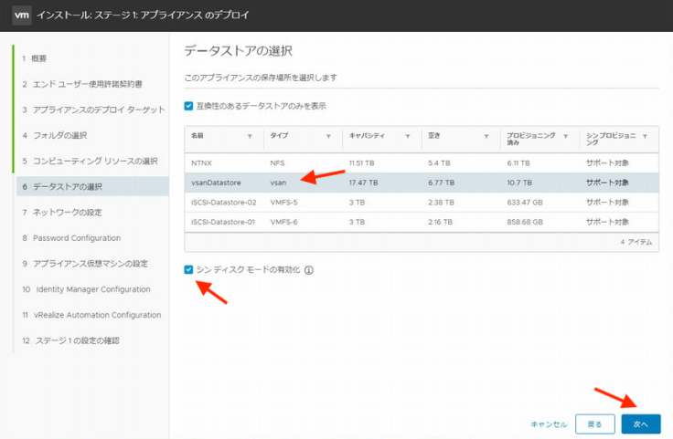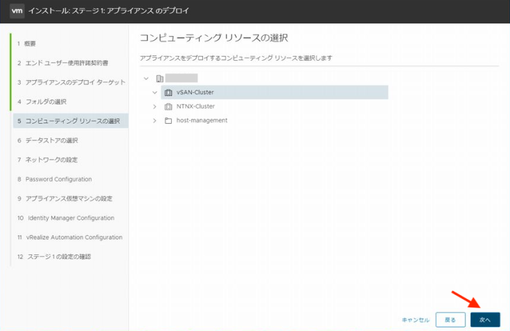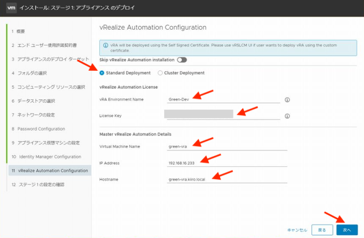 이번에는 주인공인 vRA의 배치 정보를 지정합니다. 우선 vRA의 배치 방식을 지정합니다. 1대 구성의 Standard이나 3대 구성의 클러스터를 선택합니다. Standard로 설치 후 운용중 3대 구성의 클러스터로의 스케일-아웃은 가능합니다만 Standard 구성을 스케일-업은 할 수 없습니다.