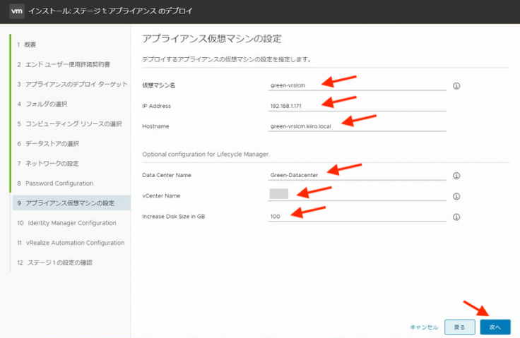 vRSLCM의 가상 머신 정보를 지정합니다. 또한 디폴트의 데이터센터와 연결되는 vCenter 그리고 vRSLCM의 디스크 확장 사이즈를 지정합니다. (vRSLCM의 디스크 사이즈는 vSLCM 배치 후에도 간단히 확장할 수 있습니다)