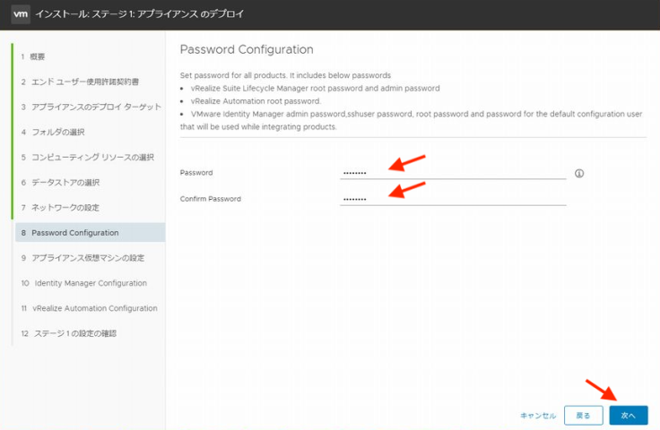 제품 설치에 필요한 패스워드를 지정합니다. 여기서 지정한 패스워드는 installerPassword로써 vRSLCM에 추가되어 vIDM와 vRA의 admin, root 패스워드로써도 이용됩니다.