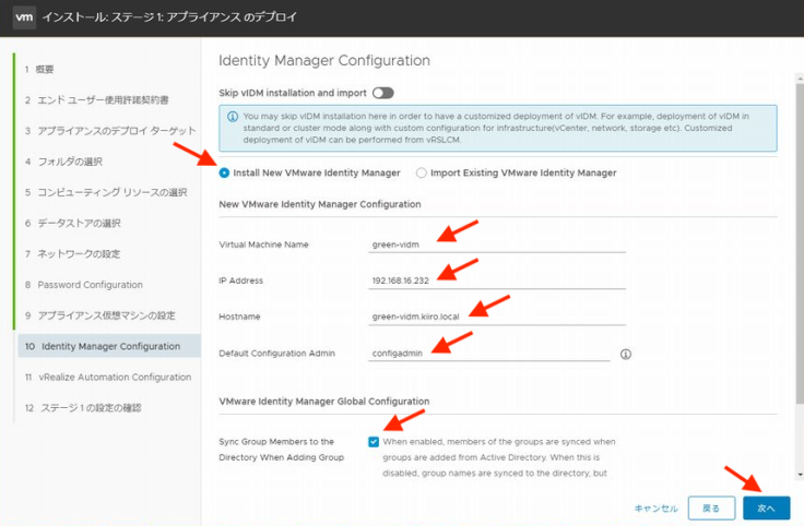 여기서부터는 vIDM의 배치 정보를 지정합니다. vIDM의 가상 머신명, IP 어드레스, 호스트명과 디폴트 구성 관리자를 지정합니다. 또한 AD 연계 시의 동기 옵션도 지정을 합니다. 참고로 여기서 지정하는 디폴트 구성 관리자는 vRA의 로컬 관리자로도 이용됩니다.