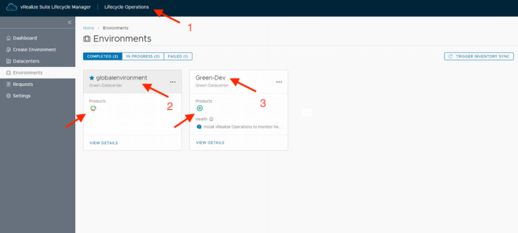 배치후 vRSLCM에 로그인해 보면 2개의 환경(Environment)이 작성되어 있는 것을 확인할 수 있습니다. 「2」는 글로벌 환경으로 vRSLCM에서 작성하는 모든 환경이 참조하게 됩니다. 이 글로벌 환경에는 vIDM이 자동적으로 배치됩니다. 다른 제품의 배치는 할 수 없습니다. 「3」은 vRA의 배치 시 지정한 이용자 환경입니다. 이 환경에는 다른 제품을 추가 설치할 수 있습니다. 참고로 이용자 환경은 첫 제품을 배치 시 작성됩니다. 「1」은 무시하세요. 잘못해서 추가한 겁니다. (;・∀・)