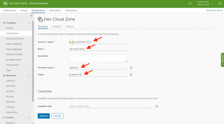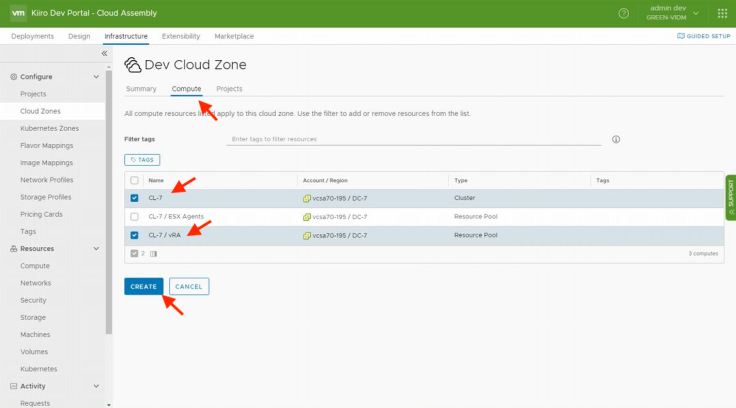 「Compute」 탭에서는 이용하는 클러스터나 리소스 풀을 선택하여 「CREATE」를 클릭하면 Cloud Zone이 작성됩니다. 「Project」 탭에서 Project 도 작성이 가능합니다만 여기서는 작성하지 않겠습니다.
