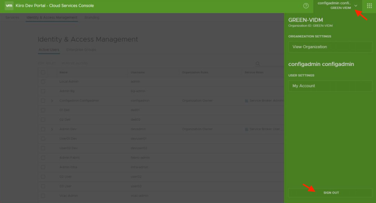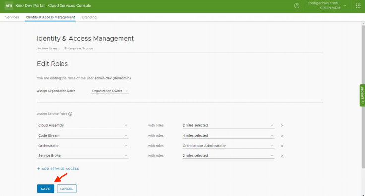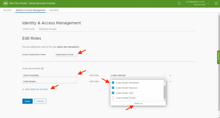 vRA에서 유저/그룹에 대한 권한 할당은 크게 두 종류가 있습니다. 하나는 조직(vRA 콘솔)에 대한 권한이며 나머지 하나는 서비스에 대한 권한입니다. 조직에 대한 권한은 ”Owner”와 ”Member”가 있습니다. 서비스에 대한 권한은 서비스별로 ”Administrator”, ”User”, ”Viewer”+α 가 있습니다. 여기서는 devadmin 유저에 대해 조직 권한은 ”Owner”, 그리고 각 서비스의 ”Administrator” 권한을 할당할 겁니다.