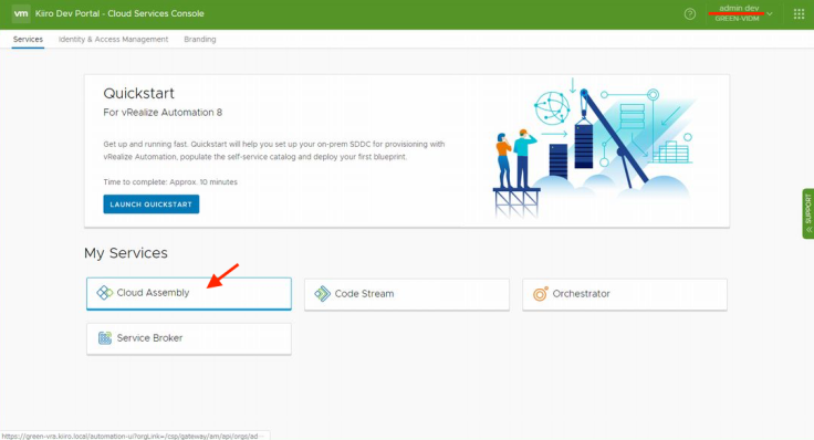 「Cloud Assembly」 서비스를 선택합니다. 「Quick Start」를 이용하면 Cloud Account부터 Blueprint의 작성까지 간단히 준비할 수 있습니다만 여기서는 각 서비스로부터의 작성 순서를 소개할 겁니다.