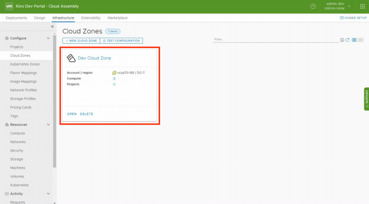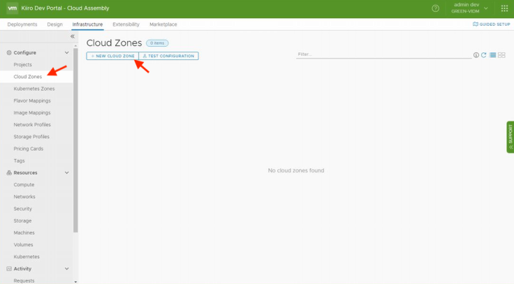 다음에는 Cloud Zone을 작성합니다. 「Configure」 → 「Cloud Zones」의 「NEW CLOUD ZONE」을 클릭합니다.