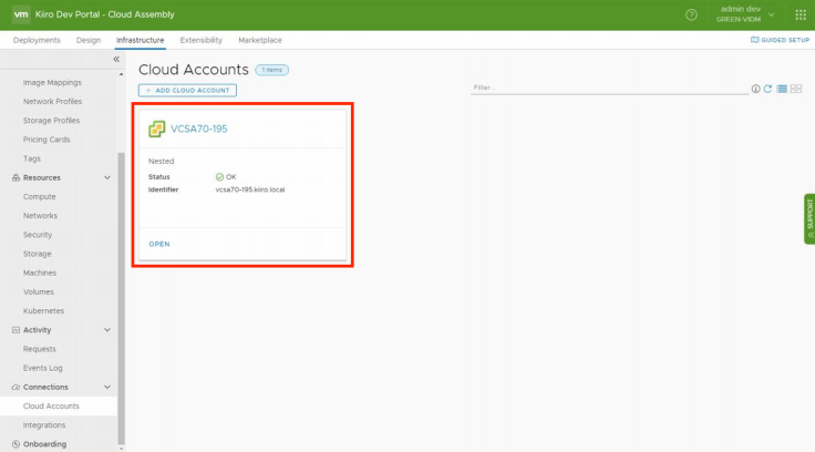 먼저 작성할 Cloud Account 이름, 접속할 vCenter의 정보를 입력 후 「VALIDATE」를 클릭합니다.