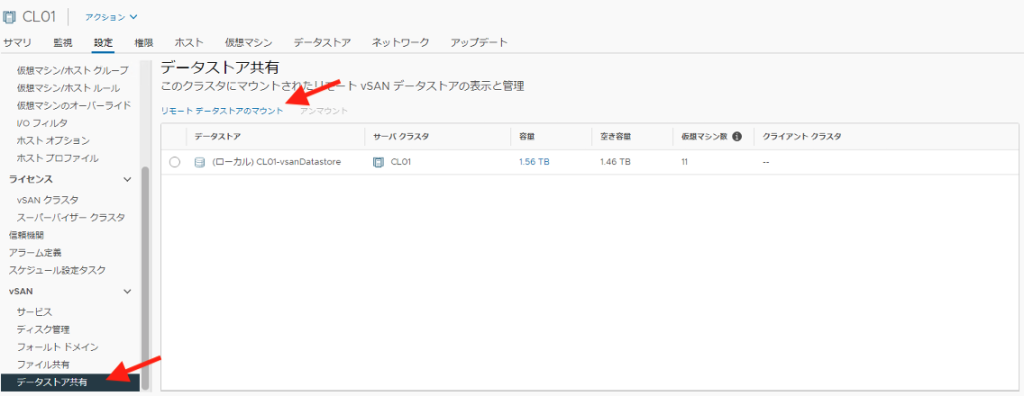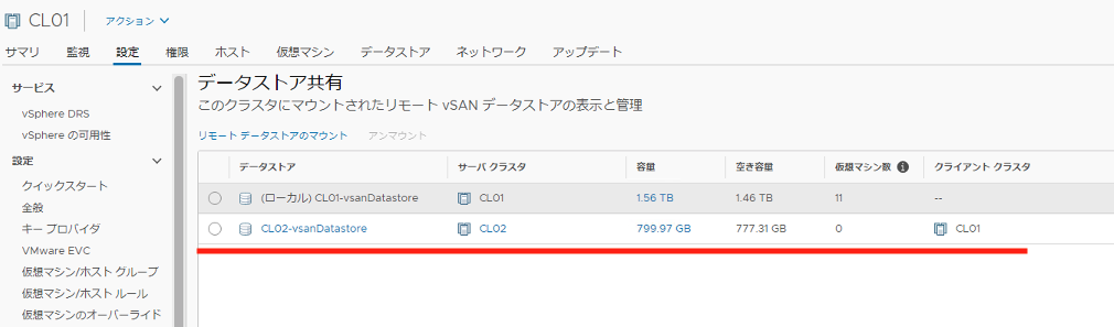 추가한 리모트 데이터스토어는 Client Cluster 측의 「데이터스토어 공유」에서 관리할 수 있습니다만 Client Cluster 측의 마운트 관련에 한정되어있습니다. 본래의 vsan 데이터스토어의 관리는 Server Cluster 측에서 이루어집니다.
