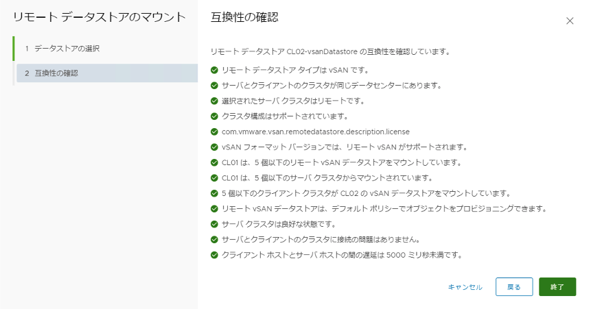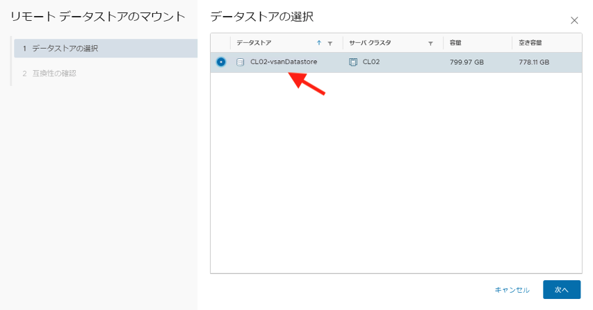 Client Cluster 측에서 「데이터스토어의 공유」 → 「리모트 데이터스토어의 마운트」에서 마운트 할 리모트 vsan 데이터스토어를 선택하기만 하면 됩니다.