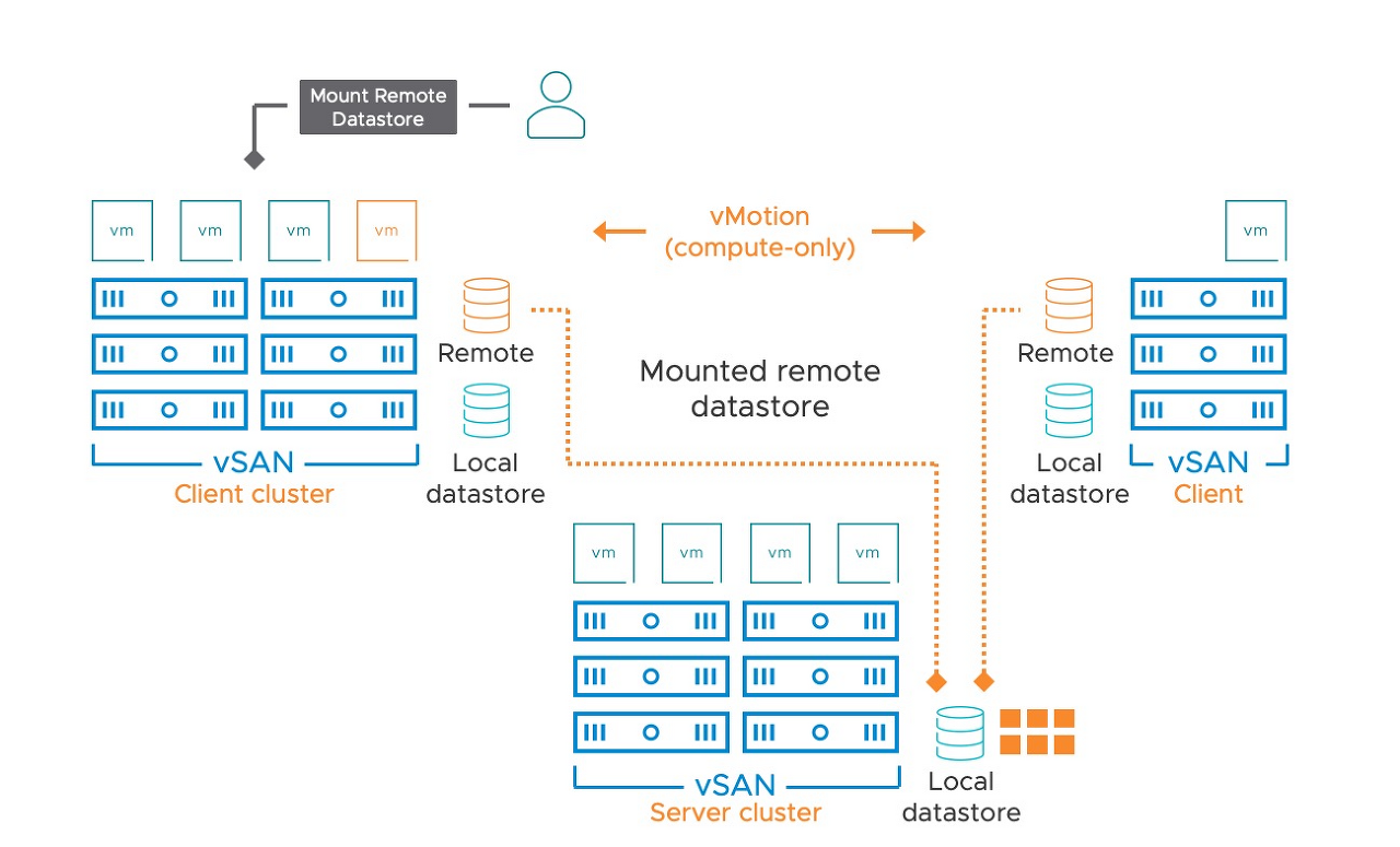 vSAN의 tech note에 공개된 위의 그림처럼 중간에 있는 vSAN 클러스트의 vsan 데이터스토어를 좌우의 vSAN 클러스터가 리모트에서 마운트 함으로써 좌우의 vSAN 클러스터는 복수의 vsan 데이터스토어를 이용할 수 있게 됩니다.