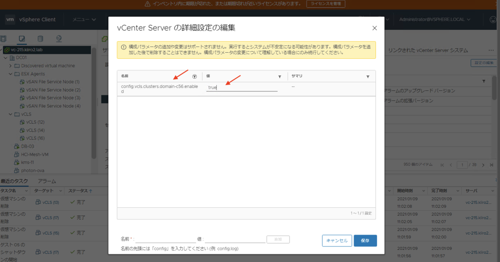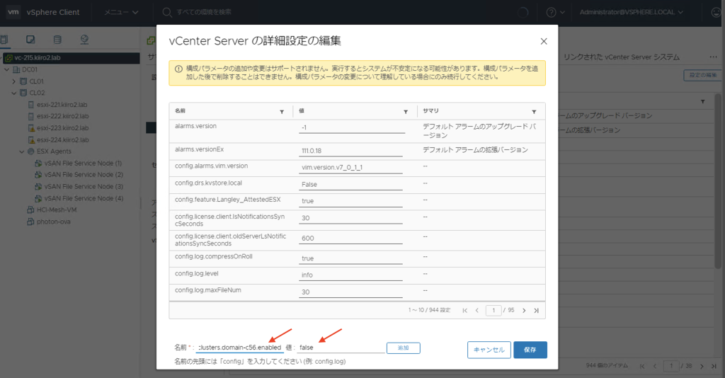 vCenter Server의 「상세 설정」에서 이번에는 파라미터를 ”true”로 변경하여 저장합니다.