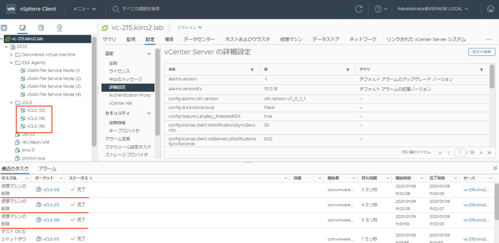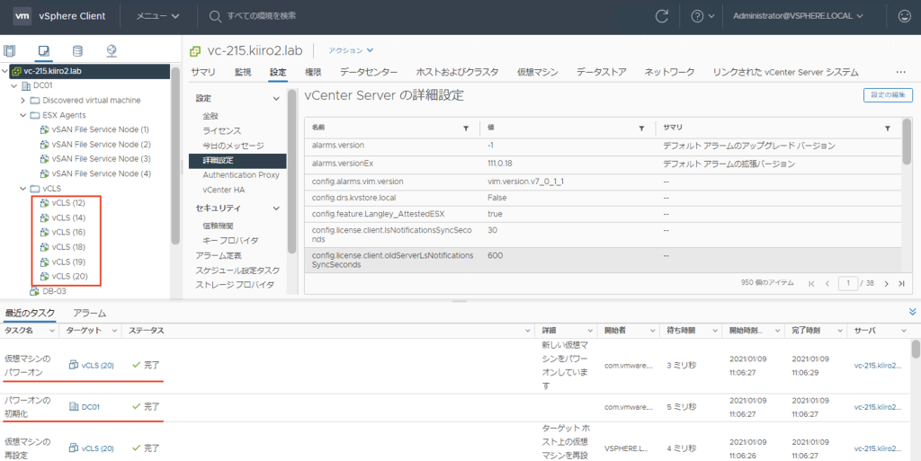 vCLS 기능은 에이전트 VM을 작성하여 vCenter Server 대신에 vSphere HA나 DRS의 기능을 제공합니다. vCenter Server 7.0 Update 1을 새롭게 도입을 하거나 7.0 Update 1로 업그레이드하면 유효화되어, 클러스터를 작성한 시점에 에이전트 VM이 자동적으로 디플로이 됩니다. 에이전트 VM은 vSphere HA나 DRS의 유효/무효와 관계없이 클러스터를 구성하는 ESXi 호스트 수에 의해 1 VM에서 최대 3 VM까지 디플로이 됩니다.