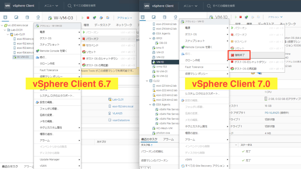 vSphere 7에서는 위의 조작에 더해 "강제 종료"란 조작이 추가되었습니다. 영어 표기는 "Hard Stop"입니다만 솔직히 "전원 끄기"와 무엇이 다른지 잘 모른 채 있었습니다만 얼마 전에 차이를 알았습니다. ;)