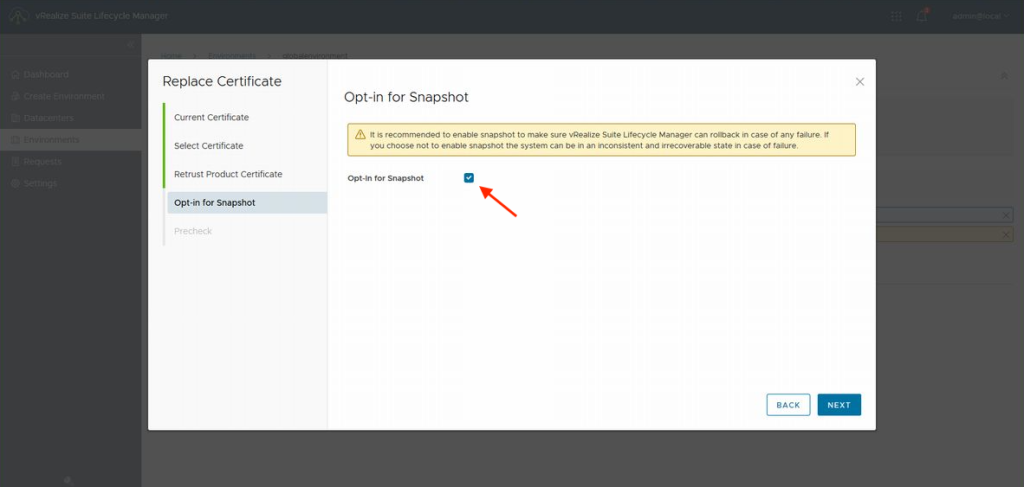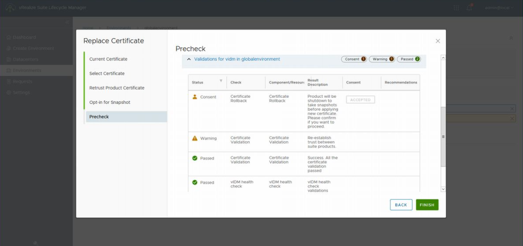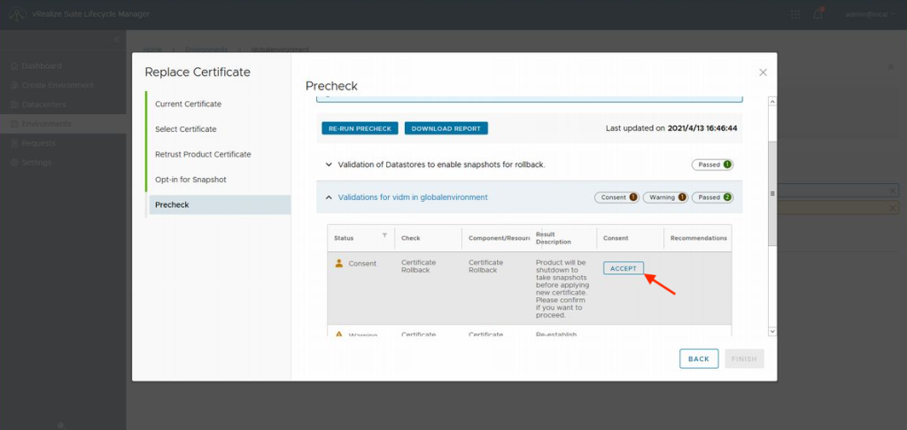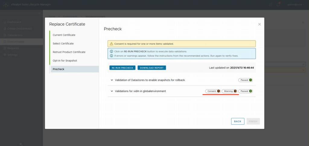 PRECHECK의 결과로 "Passed"이외에 "Consent"와 "Warning"이 표시될 겁니다. "Warning"은 인증서 업데이트로 제품 사이의 재신뢰가 이루어진다는 경고이기 때문에 무시해도 문제없습니다. "Consent"는 인증서 업데이트 전에 스냅숏을 작성하기 위해 어플라이언스를 멈추겠다는 메시지이므로 동의후 인증서의 업데이트를 실행합니다.