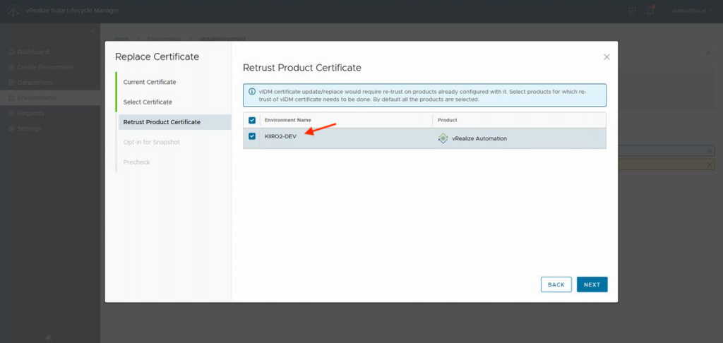 순서는 간단합니다. 업데이트할 vIDM용 인증서를 선택하여 재신뢰할 제품으로 vRA를 선택합니다.