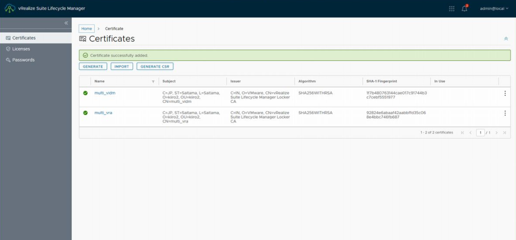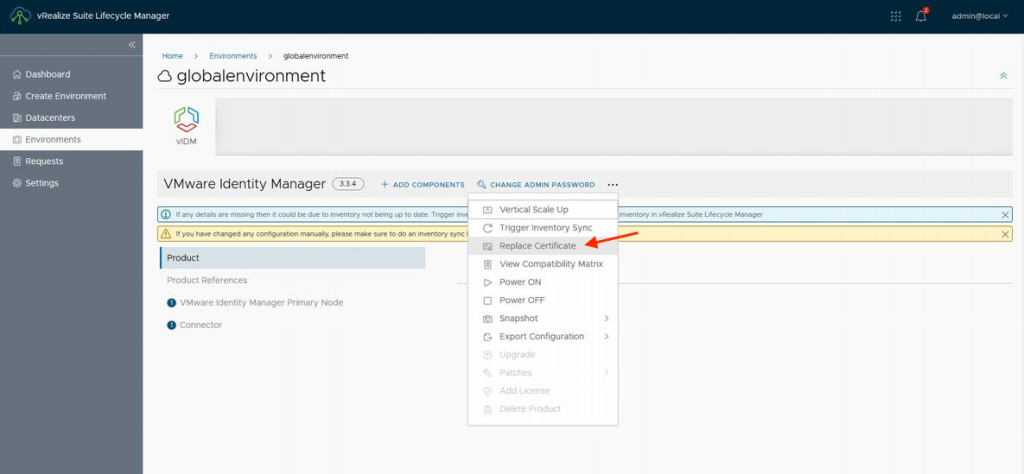 인증서가 작성되었습니다. 새로운 인증서가 준비되었다면 인증서를 업데이트합니다. 인증서의 업데이트도 vRSLCM이라면 간단합니다.