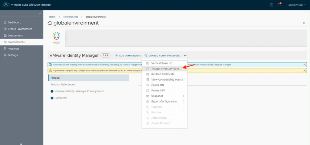먼저 vRSCLM의 「Lifecycle Operations」 → 「Environments」의 「globalenvironment」에서 vIDM의 인벤토리 동기를 실시합니다.
