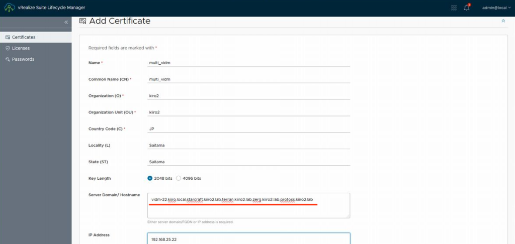 vIDM의 SAN 인증서를 작성합니다. 「Locker」의 「Certificates」에서 vIDM IP 어드레스에 대해 주체 대체 이름을 추가한 SAN 인증서를 작성했습니다.