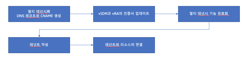 물론 vRA 8에서도 멀티 테넌시 구성이 가능합니다. 단지 vRA 단독으로는 구성을 할 수 없다는 게 옥에 티랄까요. 반드시 vRSLCM과의 연계가 필요합니다. vRSLCM에는 테넌트 관리 기능을 갖추고 있어 이 기능을 유효화함으로써 vRA에서 테넌트를 구성할 수 있게 되는 겁니다. 간단한 흐름을 보자면 다음과 같습니다.