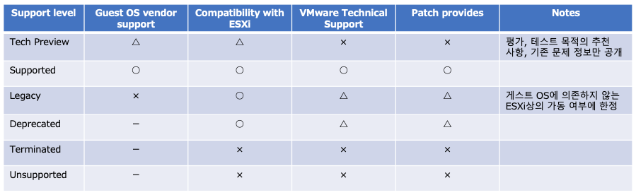 가끔 게스트 OS의 호환성에 대해서 헷갈려 하시는 분들이 계신 거 같아서 간단하게 표로 정리를 해봤습니다. 일단 VMware에서는 게스트 OS에 대해 다음과 같은 지원 레벨을 정의하고 있습니다.