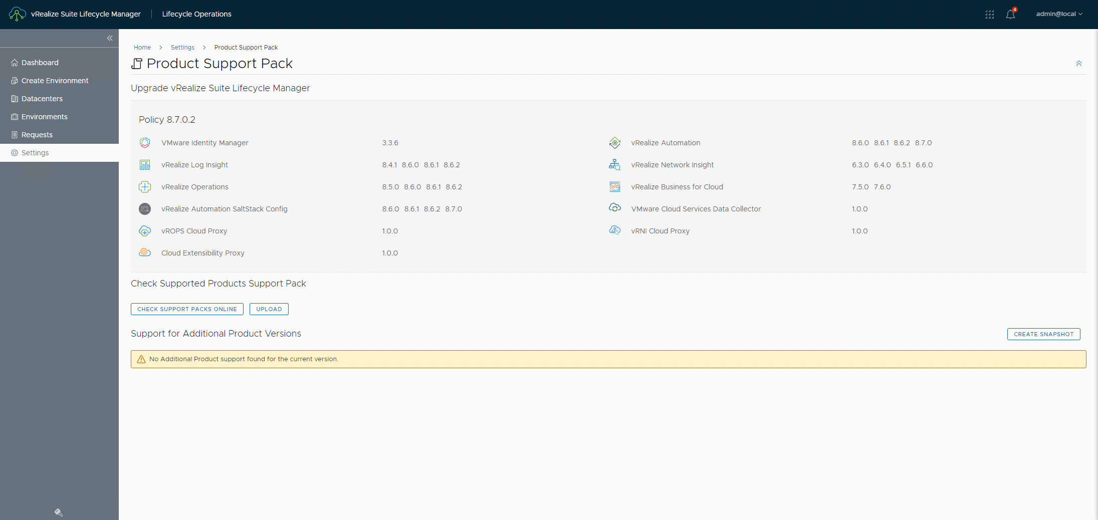 방법은 간단합니다. VMware Customer Connect에서 vRSLCM의 제품 지원 팩의 최신판을 다운로드하여 vRSLCM의 「Settings」→ 「Product Support Pack」에서 최신 정보를 반영해주면 됩니다.