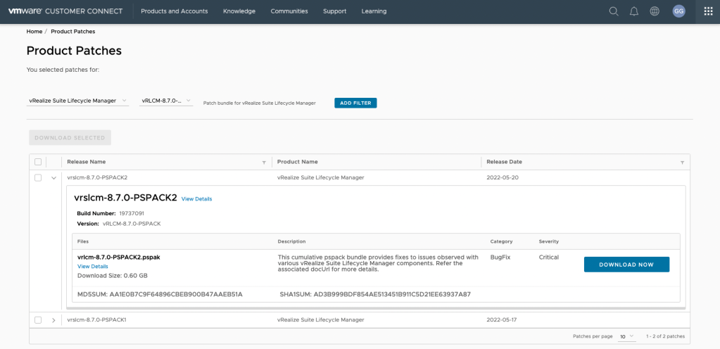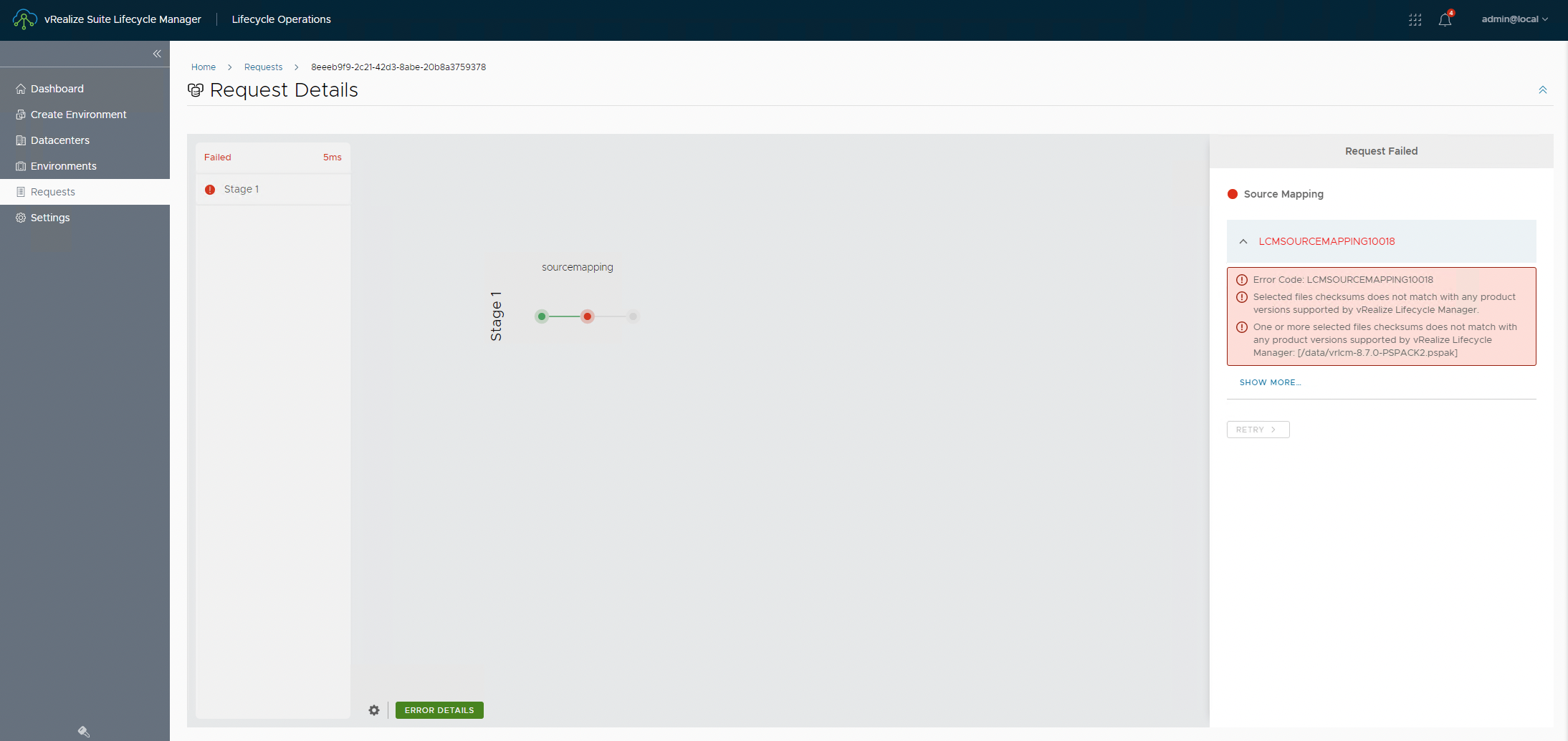 vRSLCM과 vRA의 버전은 8.7로, SSC는 8.6.2가 설치되어있기 때문에 당연히 RSLCM가 지원하는 버전입니다. 다운로드한 파일의 해시값도 확인을 했습니다만 문제가 없었죠. 조사를 해보니 vRSLCM이 갖고 있는 vRealize Suite 제품의 해시값과 다운로드한 화일의 해시값이 다를 경우도 발생하는 에러인 것 같았습니다.